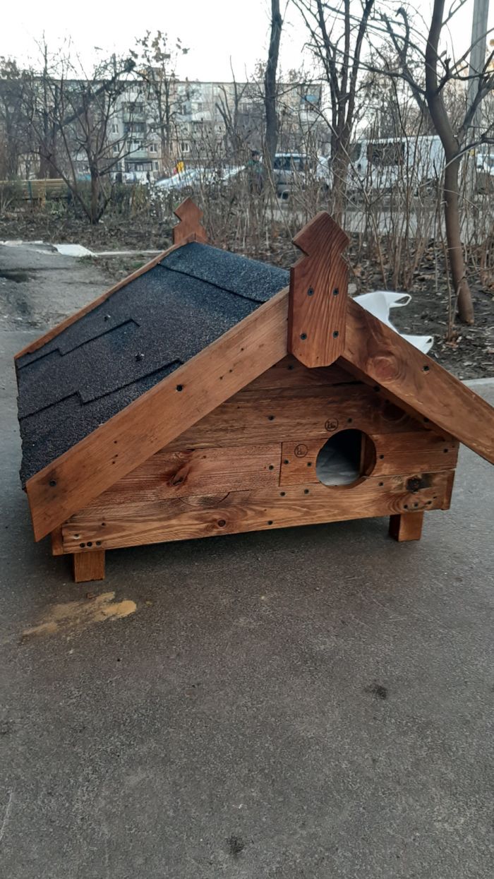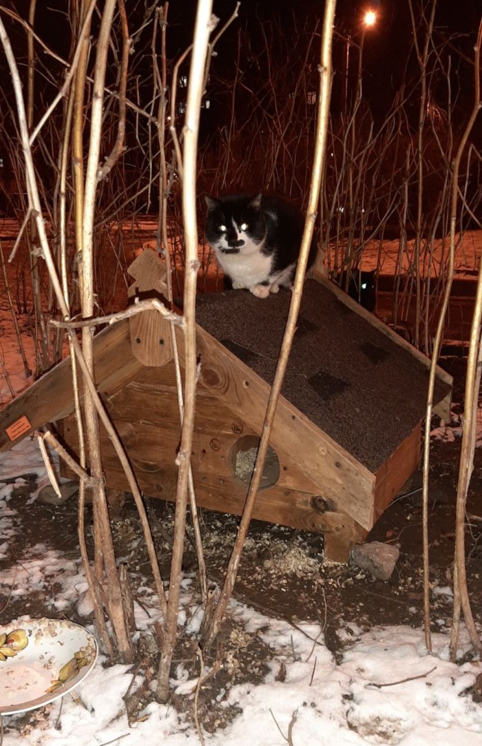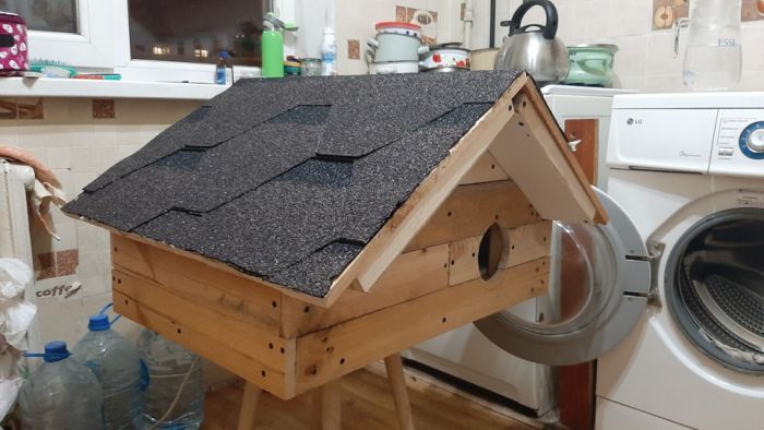 в общем с перерывами в две недели вложился) на крышу прибил мягкую кровлю (осталось с балкона), прокрасил чутка и котики довольны)