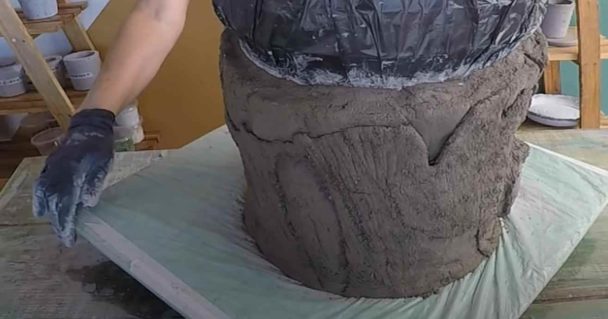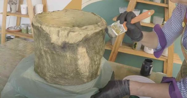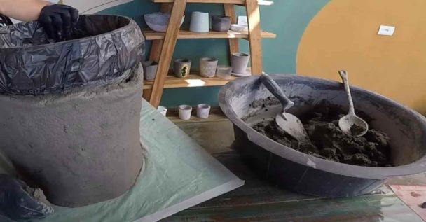 После того как цементный раствор полностью высохнет, необходимо извлечь пластиковое ведро из цветочного горшка.