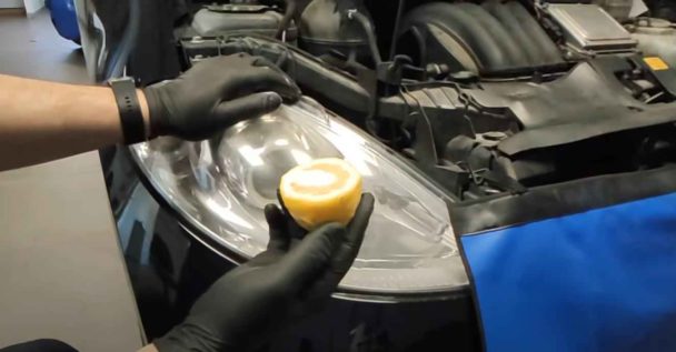 Процедуру полировки автомобильной фары желательно повторить несколько раз. Если половинка лимона уже полностью выжата, тогда берем вторую половинку, насыпаем на нее соду, и продолжаем натирать поверхность фары.