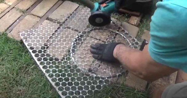 К металлическому обручу необходимо будет приварить стальную сетку. Затем обрезаем ее по контуру обруча при помощи болгарки.