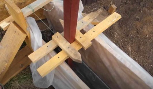 Первым делом необходимо будет забетонировать столбы. Для этого натягиваем внутри опалубки нитку от начала и до конца опалубки.