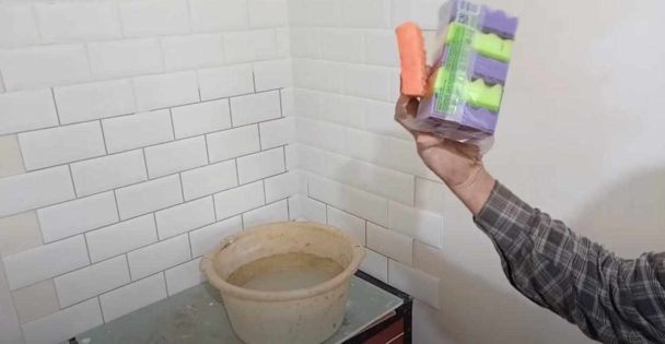Смачиваем губку или мочалку в воде, и приступаем к затирке плиточных швов. Сначала делаем движения поперек швов, потом — вдоль.
