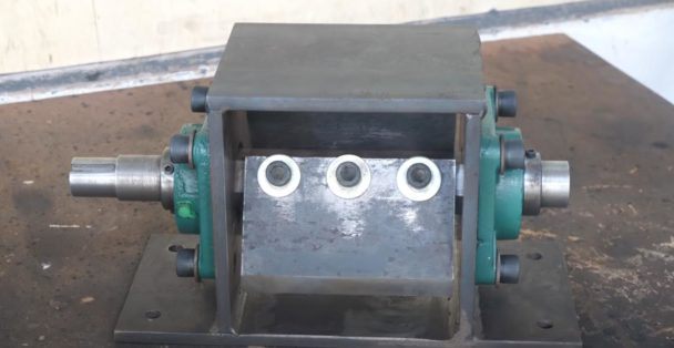 Из листового металла вырезаем две квадратных пластины. Высверливаем в них отверстия: в центре и по краям — для крепления корпусных подшипников.