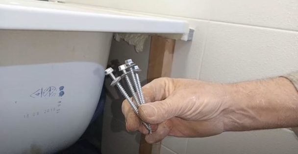 По бокам экрана высверливаем отверстия, после чего подготавливаем длинные кровельные саморезы.