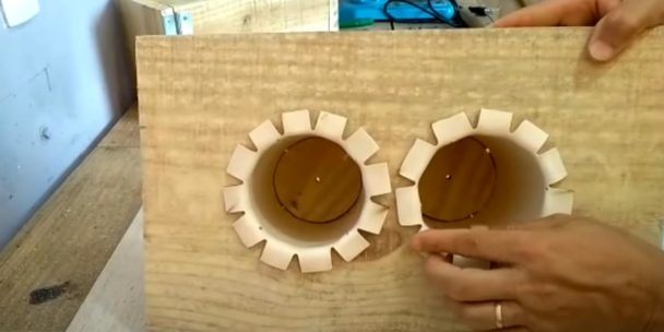 После этого подготавливаем два куска пластиковой трубы одинаковой длины. На одной из сторон обеих заготовок делаем «лепестки» и загибаем их. Вставляем ПВХ трубы в отверстия, после чего прикручиваем на саморезы снизу.