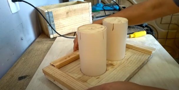 В верхнюю часть труб вставляем круги из фанеры и фиксируем на саморезу.