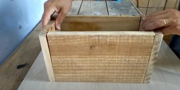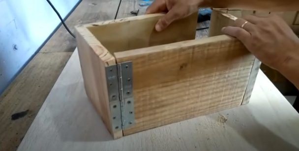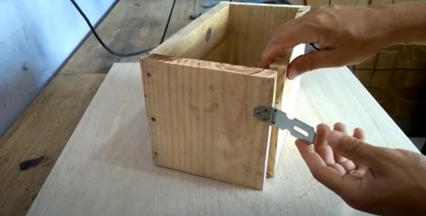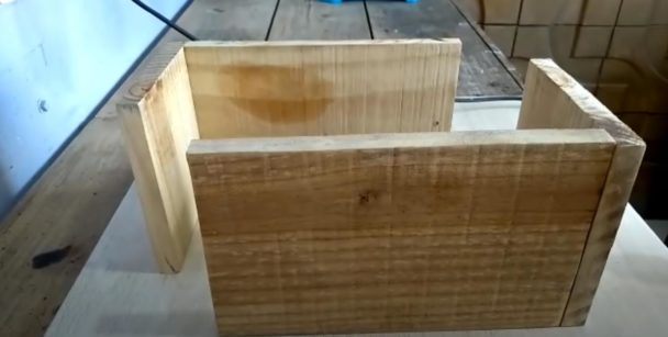 Отпиливаем доски нужного размера, из которых будет собираться короб требуемого размера. Соединяем заготовки попарно, а между собой скрепляем с помощью петель.