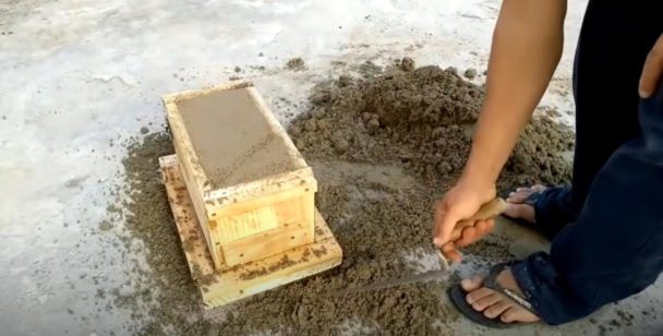 Устанавливаем форму на ровное основание. Внутренние стенки обязательно нужно смазать разделителем, чтобы раствор не прилипал.