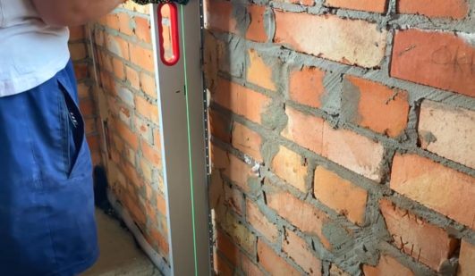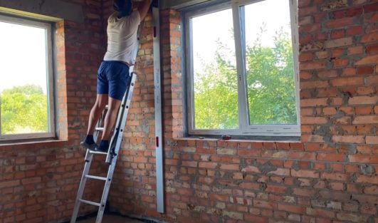 Для разметки желательно использовать строительный уровень такой длины, чтобы он захватывал все расстояние от пола до потолка. В данном случае используется уровень длиной 3 м.