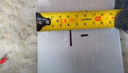 На следующем этапе берем правило или уровень и отмечаем на нем метки с двух сторон на расстоянии по 4 см от края. Отметки ставим внизу и вверху.