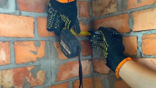 Первым делом отступаем от угла 15 см. Если в стене имеется оконный проем, то от откоса тоже надо отступить 15 см.