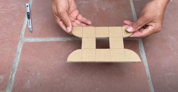 На следующем этапе из гофрированного картона вырезаем шаблон. Как он выглядит, можно посмотреть на фото ниже.