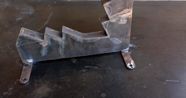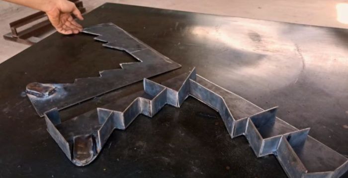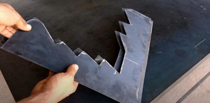 После этого нарезаем из листового металла небольшие полоски и привариваем их к одной из заготовок. Потом свариваем обе заготовки вместе. Зачищаем сварные швы.
