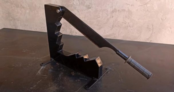 Режущий нож с рычагом, который будет колоть дрова, изготавливаем из автомобильной рессоры. Затачиваем режущую кромку.