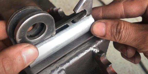 Отрезаем кусок арматуры и привариваем к нему «ушко». Вставляем арматурину в трубу и к свободному концу привариваем держатель.