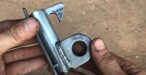 Первым делом отрезаем кусочек металлической полосы и вырезаем из него держатель для стального стержня, который будет крепиться к двери или калитке.