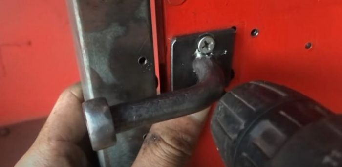 Сначала прикручиваем к двери пластину с приваренным к ней стержнем. Затем крепим самодельную защелку, предварительно выставив ее как нужно.
