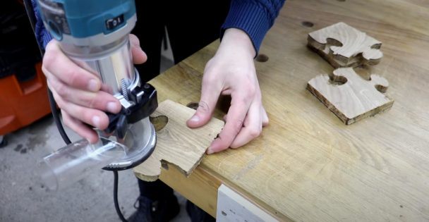После того как вырезали четыре подставки, обрабатываем их кромку ручным фрезером, потом шлифуем на гриндере. При необходимости можно доработать детальки бормашинкой. Наша задача — сделать так, чтобы пазлы свободно собирались и разбирались.