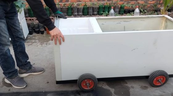 По бокам привариваем болты и надеваем на них колеса. На основание устанавливаем холодильник.
