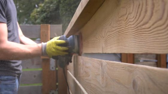 После того как поверхность забора полностью высохнет, обрабатываем доски орбитальной шлифовальной машинкой.