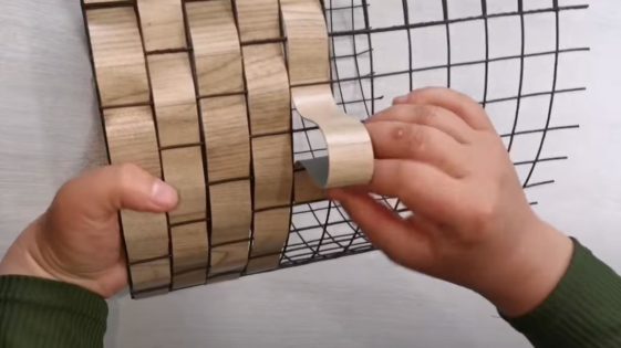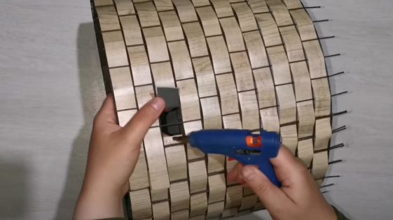 Края полос в каждом ряду стыкуем друг с другом с небольшим нахлёстом. Склеиваем края с помощью термоклея.