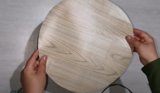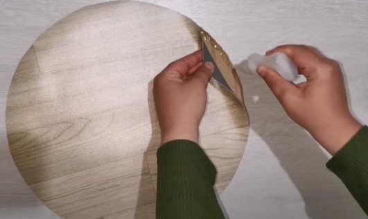Сверху приклеиваем круг из линолеума. Затем вырезаем полосу из линолеума и обклеиваем кромку.
