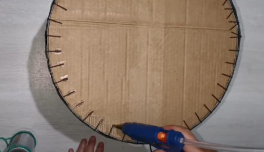Устанавливаем дно в нижнюю часть кашпо и фиксируем снизу оставленными кусочками сетки, загибая их. Дополнительно фиксируем с помощью термоклея. На нижнюю часть дна кашпо наклеиваем круг из линолеума.