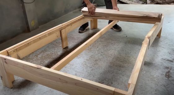 К внутренней стороне боковин прикручиваем опорные деревянные рейки, на которые будут опираться планки для матраса.