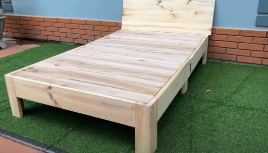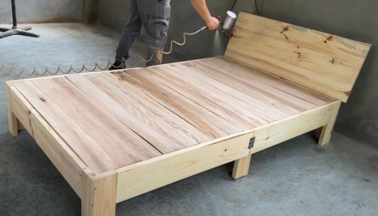 В завершении останется только прикрутить к передней части кровати откидное изголовье и покрыть собранную мебель лаком по дереву.