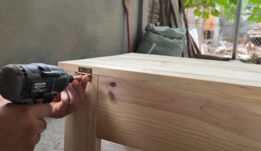 В месте стыка двух частей боковой царги дополнительно прикручиваем опору из куска доски. На противоположной стороне поступаем аналогично.