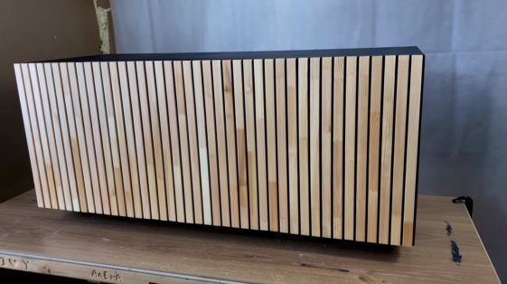 Наружную сторону дверок облицовываем предварительно отшлифованными деревянными рейками, а потом обрабатываем шлифмашинкой выступающие края реек в нижней и верхней части дверей, чтобы они были заподлицо с кромкой.