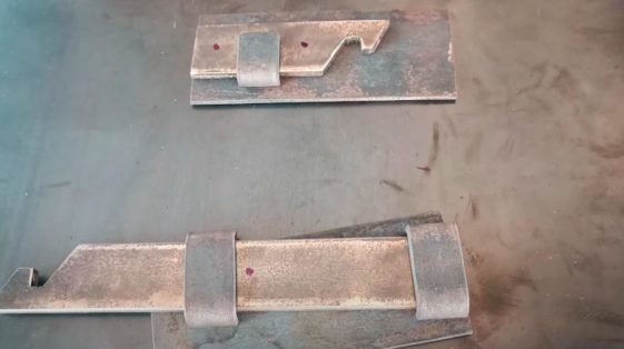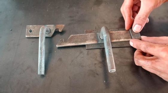 На следующем этапе подготавливаем две металлических пластины размером 12х5 см. К ним нужно приварить скобы из полосы, которые выступают в качестве направляющих для ригеля самодельной защелки.