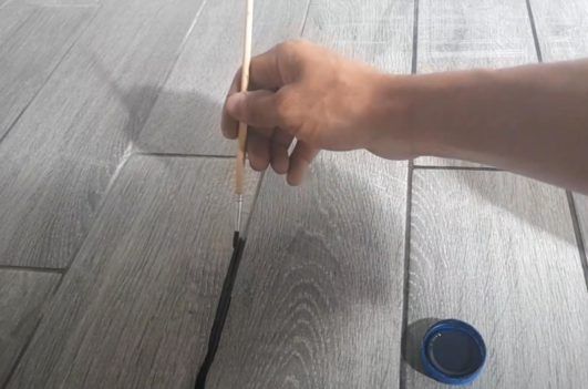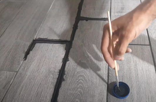 Далее наливаем небольшое количество смеси в крышку или любую другую емкость и с помощью кисточки начинаем закрашивать межплиточные швы.