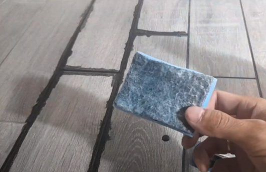 Смачиваем ее в чистой воде и вытираем поверхность плитки. Загрязнения на плитке отлично убираются, при этом сами швы остаются закрашенными.