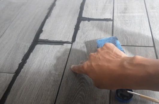 Поскольку поверхность керамической плитки не впитывает грунтовку с колером, то можно особо не переживать если вы запачкаете напольное покрытие. Все легко отмывается.