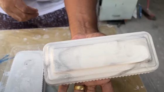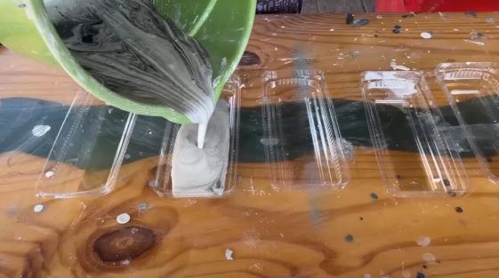 Чтобы сделать эффект мрамора на поверхности плитки, автор добавил в гипсовый раствор немного черного красителя и слегка перемешал палочкой.