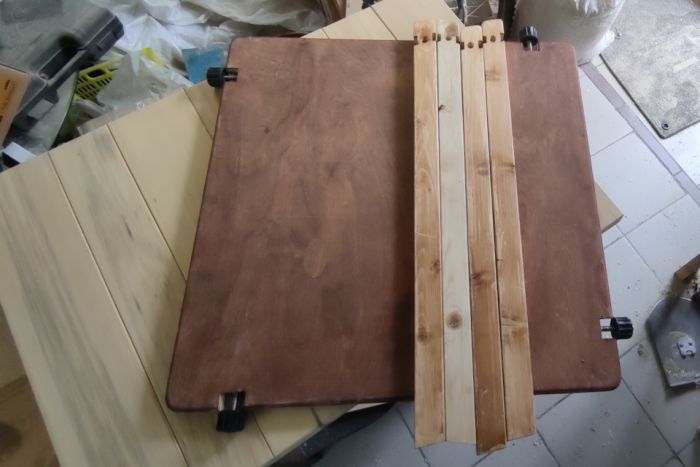 Т.к. мы с супругой любим путешествовать на авто, и в последнее время родственники компанию не делают составлять, то решил изготовить небольшой столик на двоих-троих человек. Основная задача — плоскость конструкции. Использовал лист фанеры 580*580*15 и 4 палки на ноги. В торце фанеры сделал запилы под ноги под небольшим углом и вкрутил туда сантехнические шпильки.