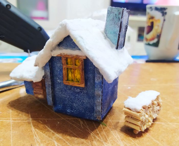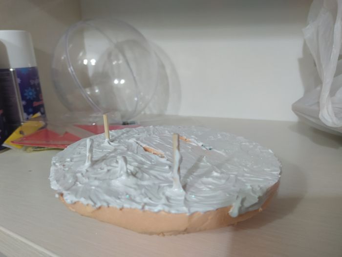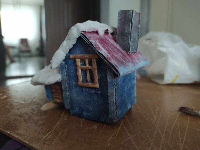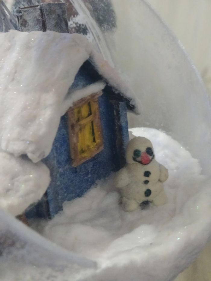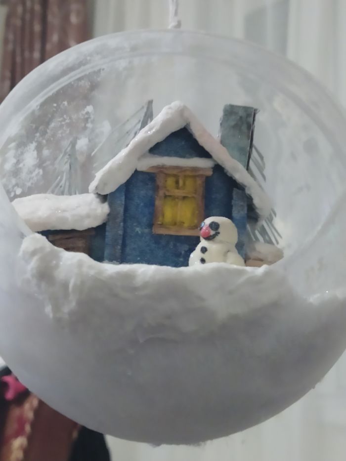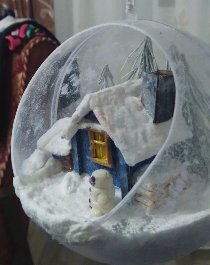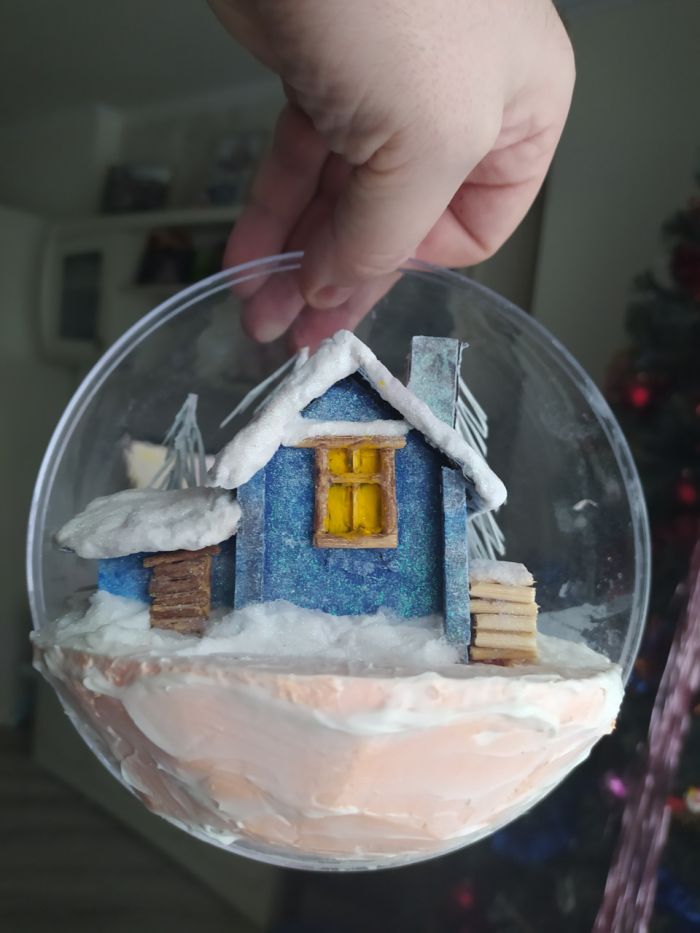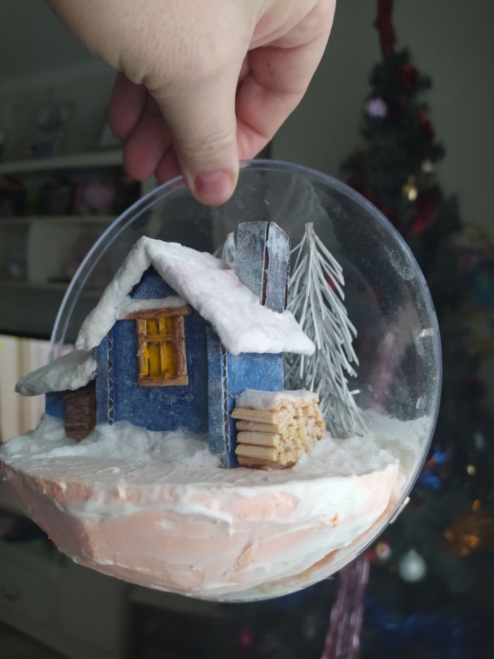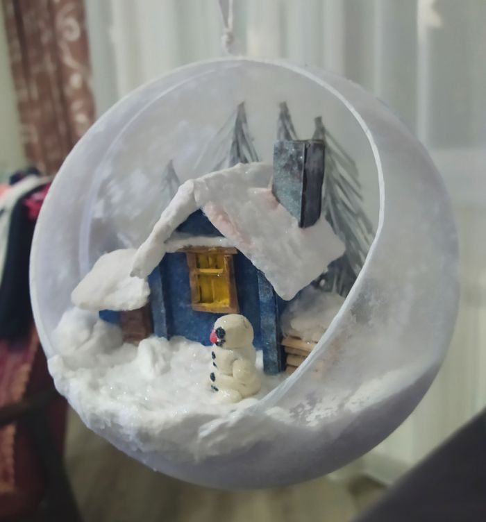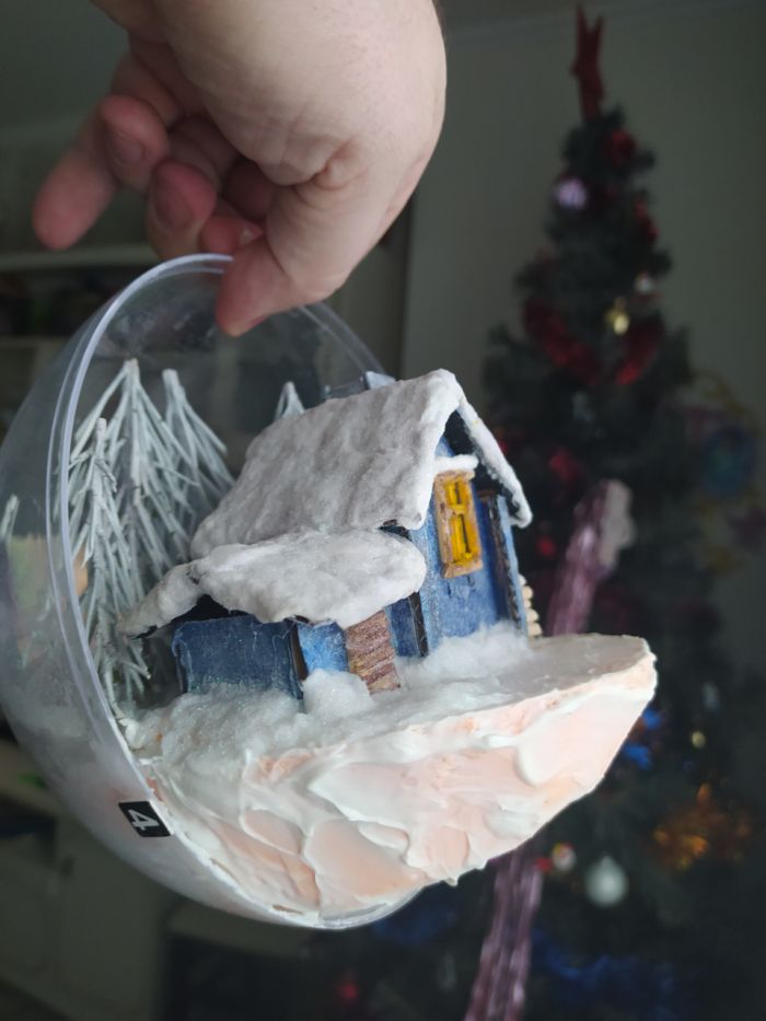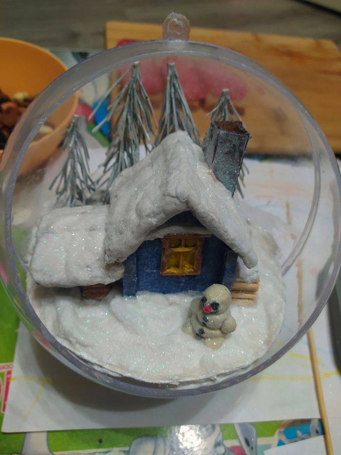 Всем привет! Мысль подсмотрела на ютюбе и снова с детьми мы приступили к исполнению, но на свою тему. купил шары в магазине Леонардо. дом слепили из картона, дрова из нарезанных шпажек, снег и сугробы все та же вата пропитана пва и усыпано блестками для блеска, снеговик из пластилина, елки это ветки от сосны окрашены в белый и вклеены в основу из пеноплекса.