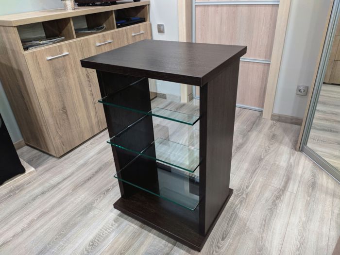 Стекло 10мм с обточкой по всем сторонам. Для фиксации стекла достаточно 5мм квадратиков двухстороннего скотча по периметру. Техника нравится черная по этому дерево заказал венге, думаю как то более хорошо смотрится.