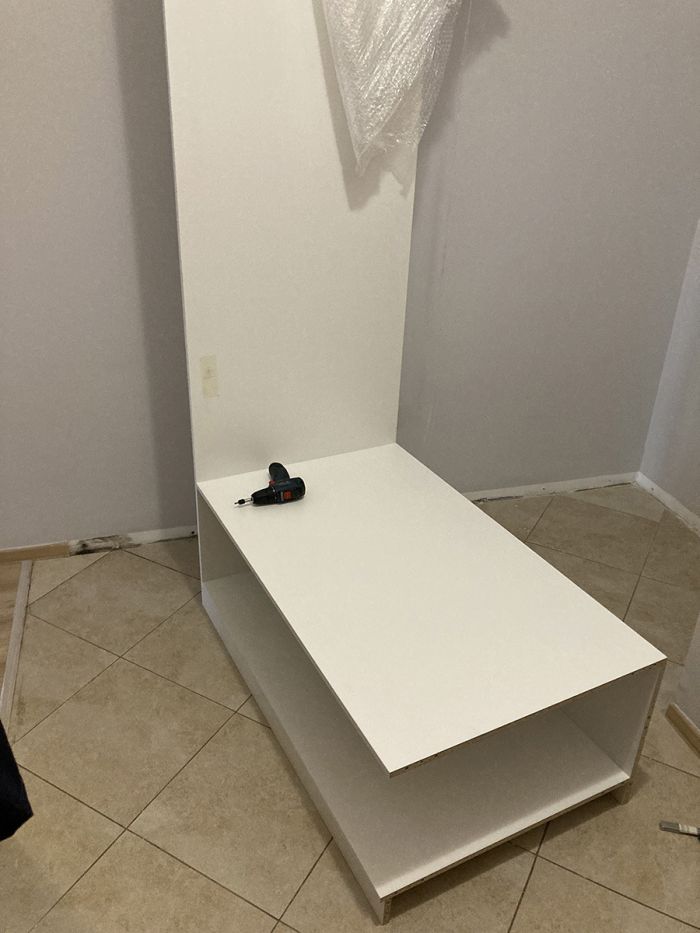 Далее несколько фотографий по шагам. Пытался разработать технологию сборки, но потом понял, что места мало, а носить шкаф я не смогу, то остаётся один вариант — собирать сразу стоя. Не желая повреждать стены, я решил на них ничего не облокачивать и начать сборку снизу.