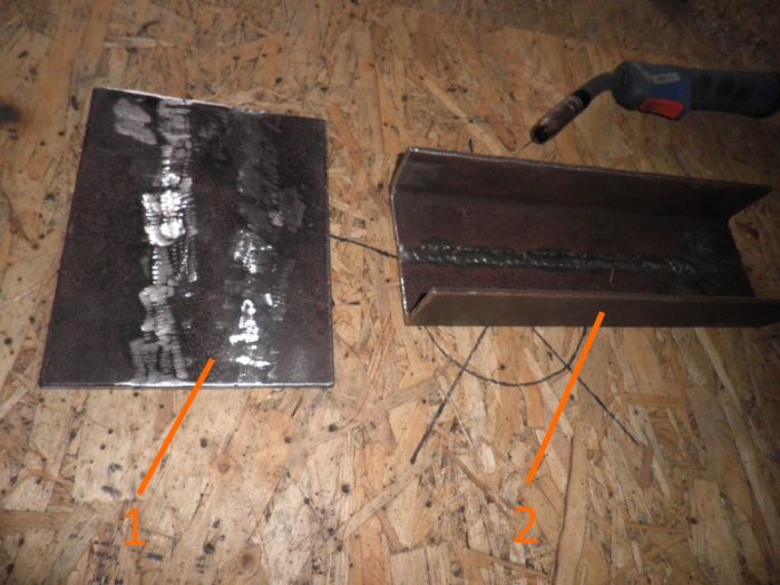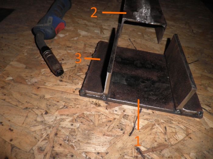 1. С начала делал нижнею "площадку" 15х20 cm (сварил из трёх частей). Дале взял швеллер 10х30cm (сварил из двух уголков). Варил параллельно промежутками с одной стороны и с другой- чтоб не согнуло металл.