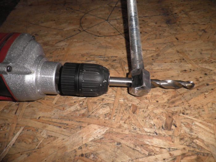 8. На шпильке надел шайбу всунул в отверстие, опять шайба- закрутил гайку М18. Перед тем гайку сверлил, делал резьбу и застопорил болтом М5- чтоб не открутилась.