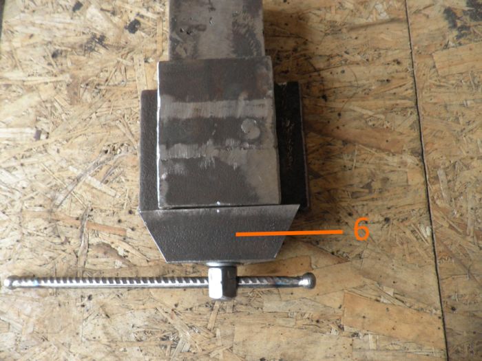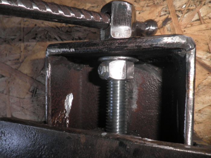 7. Дальше доделал шпильку. Длина такая как и швеллера (на 2см. длиннее). С переди накрутил две гайки, обварил, закруглил и просверлил отверстие для ручки. Ручка из арматуры 12mm.