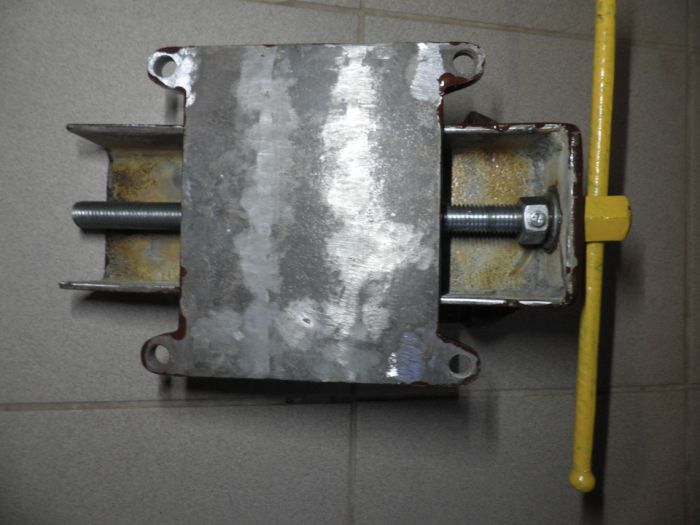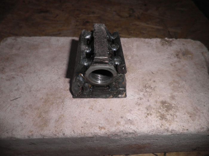 4. Дальше делал Гайку переходную. Тут конечно луче купить готовую. Но так уж получилось… Накрутил три гайки на шпильку и сначала прихватил гайки на листе железа с низу. Потом по бокам ставил ленточки и тоже прихватил полуавтоматом. После этой процедуры не помешало пройтись метчиком. Когда всё готово привариваем по центру (высота, ширина) к швеллеру.