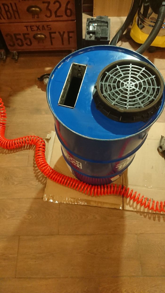 Для начала вырезал пневмоножницами отверстия под динамики и место для магнитолы. Внутри после очистки остатков масла и обезжирки стенок наклеил через отверстия под динамики 2-х мм.шумоизоляцию STP AERO (ушло 2,5 листа 0,47х0,75 м.) . А посередине вложил поролон по диаметру бочки. Так же сделал 2 отверстия под фазоинверторы. В одно из резьбовых отверстий как родное вошло гнездо прикуривателя от ВАЗ-2101, через него можно запитать магнитолу от аккумулятора, а параллельно сверху от него просверлил отверстие под гнездо для подключения блока питания.