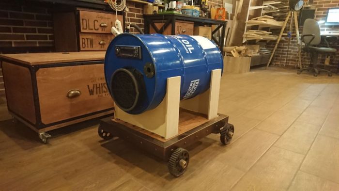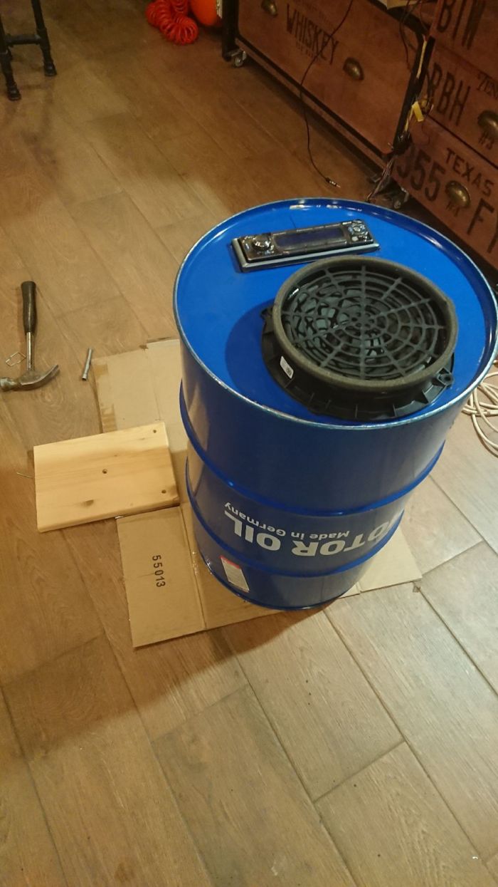 Магнитола оставшаяся не у дел еще со времен владения Т4 пылилась в одном из ящиков в гараже, динамики недавно были сняты с Allroadа (начали похрюкивать). А бочка освободилась после продажи масла в розлив.