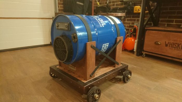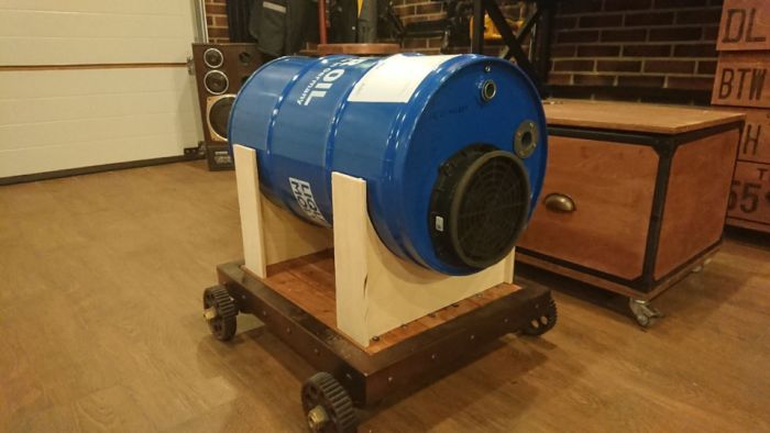 Сначала была идея поставить бочку на козлы для распила дров, но вспомнил о тележке, на которую сделал лафет из фанеры и притянул к нему изделие с помощью кожаных ремней