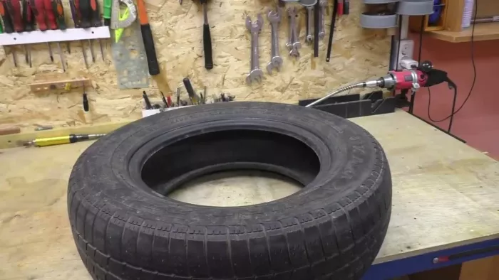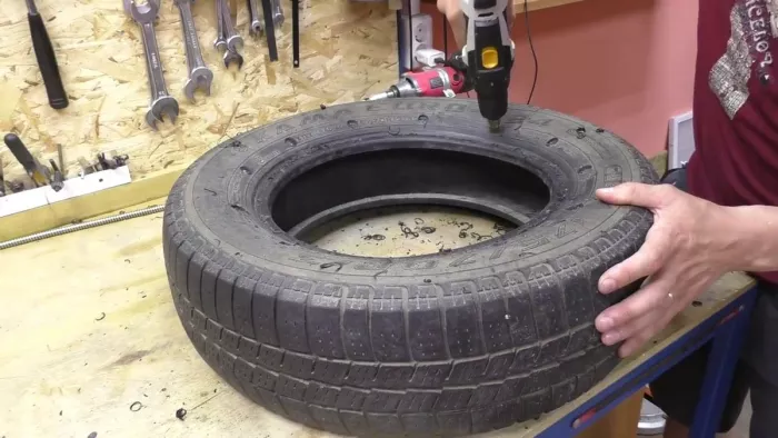 Первым делом в покрышке нужно насверлить отверстия по кругу. Для сверления лучше всего подходит конусное сверло.