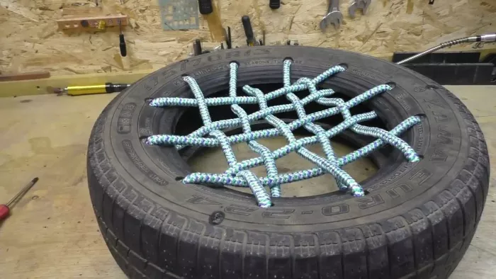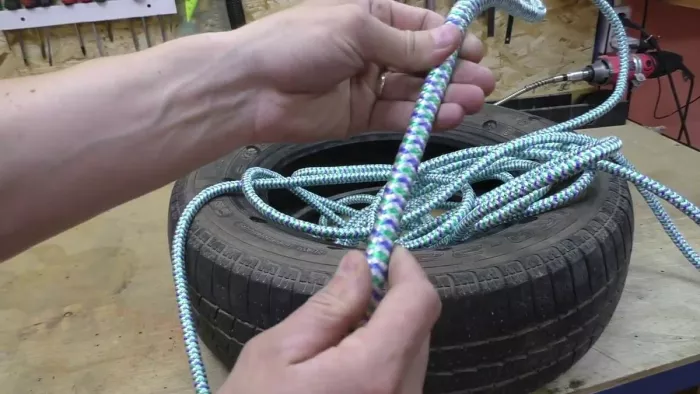 Теперь потребуется какая ни будь толстая веревка. Главное что бы она проходила через ранее просверленные отверстия.