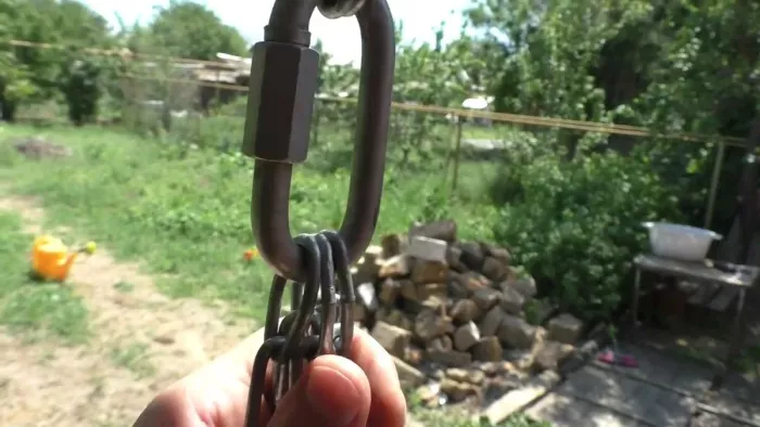 То бы качель подвесить на цепи, установил в трех местах шпильки с карабинами.